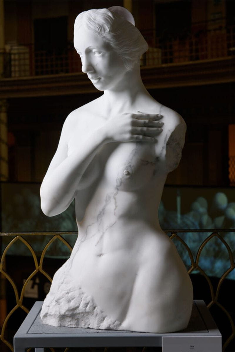 In Gea, scultura che rappresenta la Terra, i microrganismi non entrano in contatto diretto con il marmo né con l’ambiente esterno, ma sono confinati in una sfera posta sulla testa della statua e contenente il terreno di coltura. “Al suo interno i batteri crescevano, mutavano e si trasformavano, dando vita a colori, forme e texture diverse che evolvevano nel tempo, rendendo l’opera viva e in continuo cambiamento: un vero e proprio dialogo tra materia, energia e vita microscopica”, racconta l’artista Alessia Forconi.