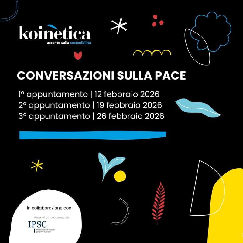 Da questa visione nasce Conversazioni sulla pace, il ciclo di incontri organizzato da Koinètica, attiva dal 2002 nella promozione culturale e nella comunicazione della sostenibilità, in collaborazione con l’IPSC – International Peace Science Center dell’Università Cattolica del Sacro Cuore di Milano, centro di ricerca impegnato nello studio scientifico della pace, dei conflitti armati e della violenza politica.